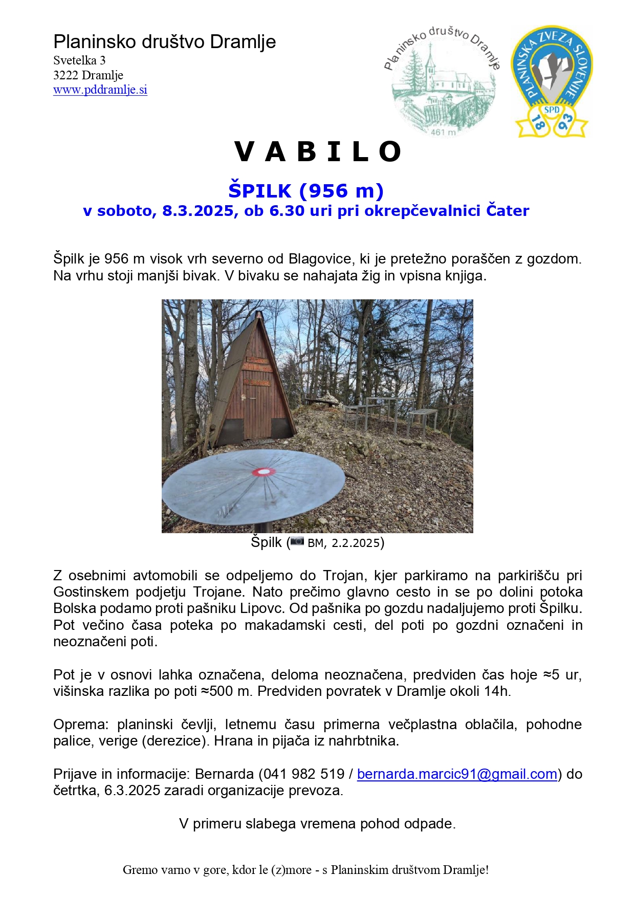 po planu pohodov za letošnje leto, vas v soboto, 8.3.2025 z odhodom ob 6.30 uri od Čatra, vabimo na pohod na Špilk. Podrobnosti so razvidne v priloženem vabilu.