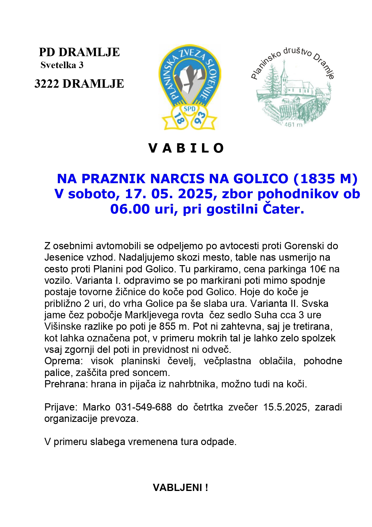 Vabilo – Izlet Golica