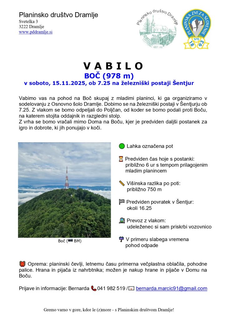 po planu pohodov za letošnje leto, vas v soboto, 15.11.2025 ob 7.25 uri z odhodom vlaka iz Železniške postaje Šentjur, vabimo na pohod na Boč skupaj z mladimi planinci. Podrobnosti so razvidne v priloženem vabilu.