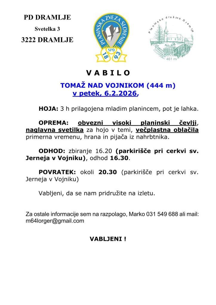 Vabimo vas na večerni pohod na Tomaž, ki bo tokrat namenjen predvsem mlajšim planincem, dobrodošli pa ste tudi vsi ostali člani društva. Dobimo se v Vojniku pri cerkvi sv. Jerneja, od koder se bomo skupaj podali na prijeten večerni vzpon.